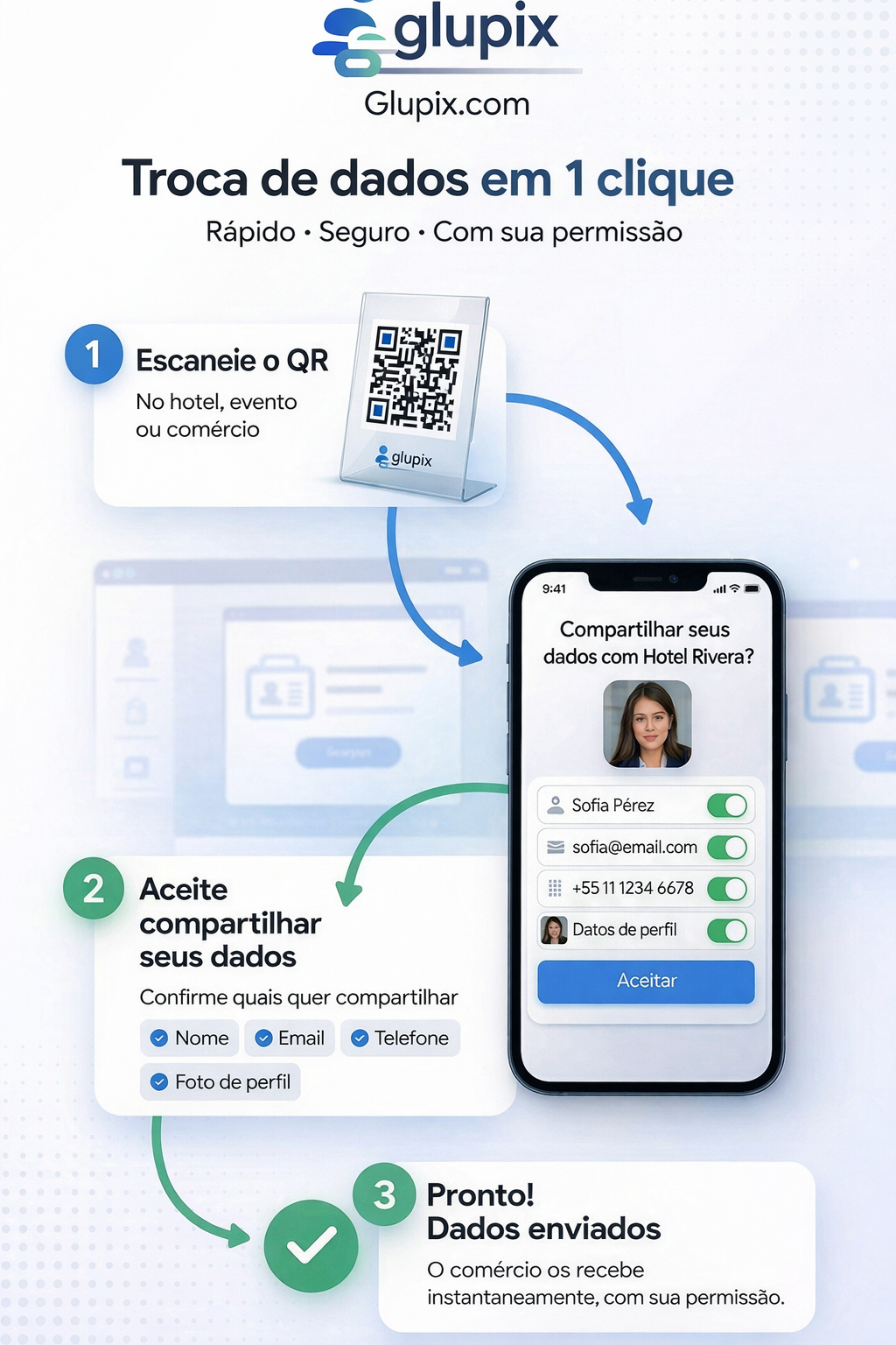 glupix.com permite que qualquer comércio solicite dados de forma clara, rápida e universal. O cliente escaneia o QR, revisa os dados solicitados, aprova e o comércio recebe tudo em tempo real.